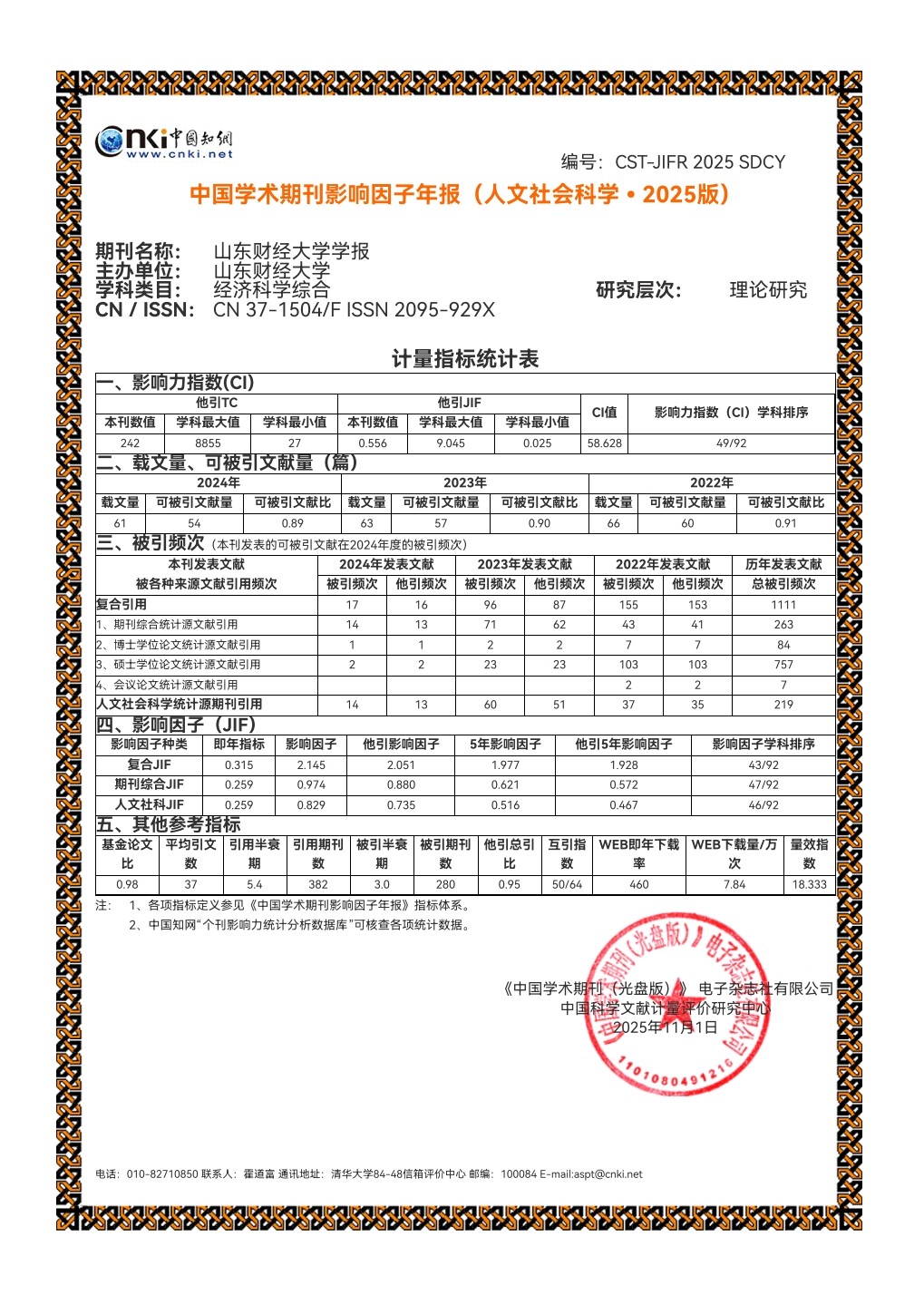 近日,《中国学术期刊影响因子年报(人文社会科学·2025版)》正式发布。《山东财经大学学报》在多项关键评价指标上实现显著提升,学术影响力进一步增强,展现出良好的发展态势。