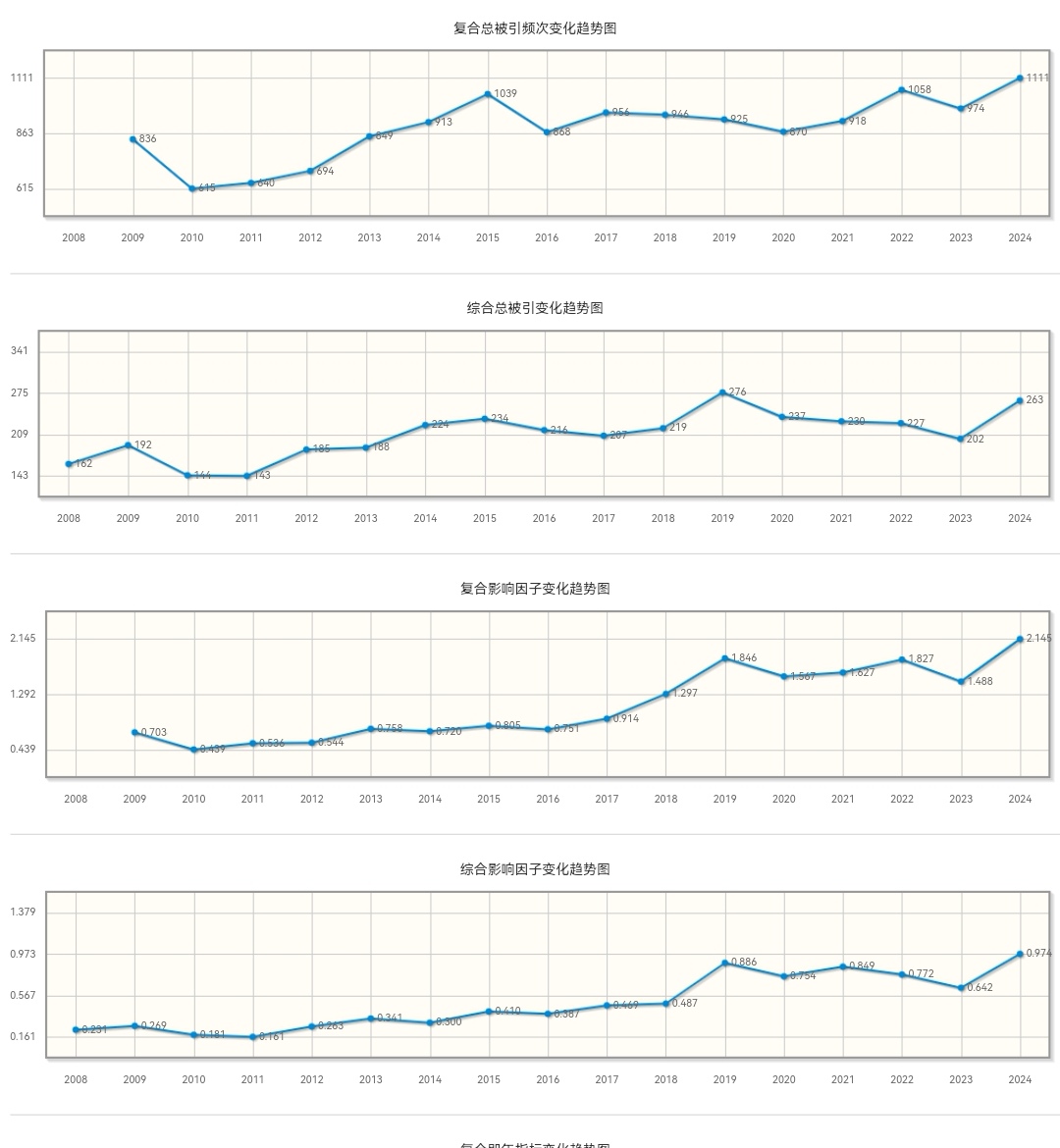 根据年报数据显示,《山东财经大学学报》复合影响因子由2012年的0.544提升至2.145,增长约3.9倍;期刊综合影响因子由2012年的0.263提升至0.974,增长约3.7倍;复合总被引频次从2012年的694次上升至1111次,增长约1.6倍。反映出本刊发表的学术成果受到越来越广泛的关注与引用。